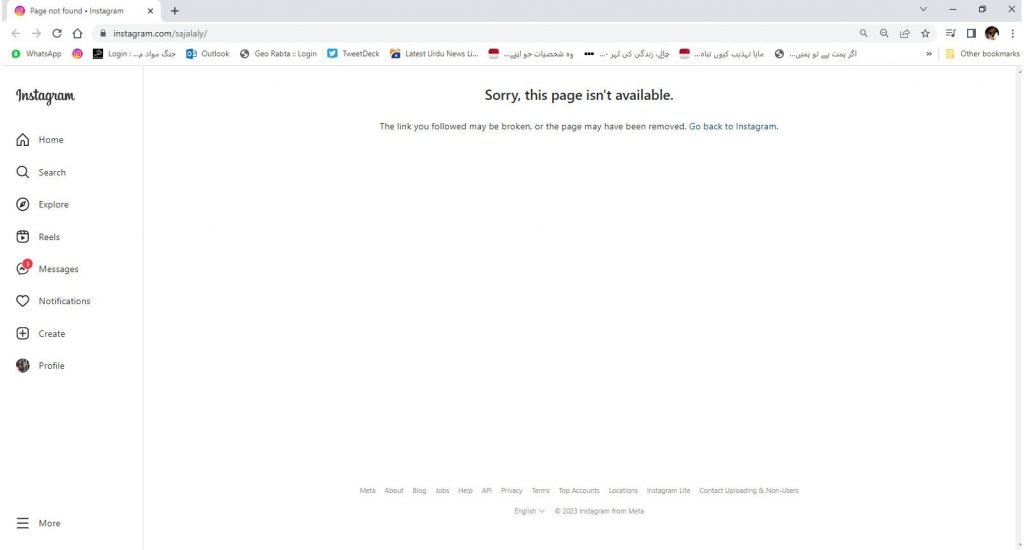 پاکستان شوبز اندسٹری کی خوب رو اداکارہ سجل علی انسٹاگرام سے غائب ہوگئیں۔فوٹو اینڈ ویڈیو شیئرنگ پلیٹ فارم انسٹاگرام اداکارہ سجل علی کو سرچ کرنے سے قاصر ہے، جو اس بات کا عندیہ ہے کہ اداکارہ نے اپنا انسٹا اکاؤنٹ ڈلیٹ کر دیا ہے۔تاہم تاحال اس کی وجوہات سامنے نہیں آئی ہیں لیکن سجل علی کے مداحوں کی جانب سےبنائے گئے ان کے فین پیجز کے مطابق اداکارہ گزشتہ رات سے انسٹاگرام سے غائب ہیں۔سجل علی نے اپنا اکاؤنٹ ڈیلیٹ کیا ہے یا یہ ہیک ہوگیا ہے یا پھر اسے عارضی طور پر بند، ابھی اس حوالے سے کچھ کہا نہیں جاسکتا۔تاہم اداکارہ سجل علی اس وقت مائیکرو بلاگنگ سائٹ ٹوئٹر پر موجود ہیں اور آپ مداحوں کو جواب دے رہی ہیں۔