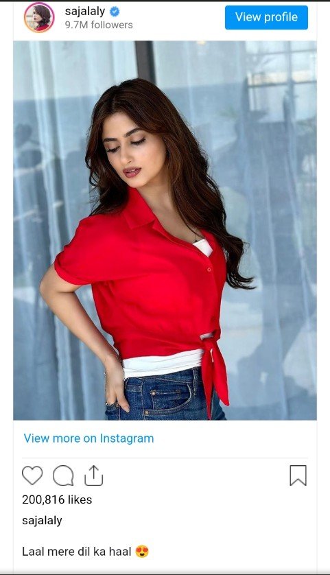 راولپنڈی (نیوز ڈیسک )لالی ووڈ و ڈرامہ انڈسٹری کی معروف اداکارہ سجل علی نے سوشل میڈیا پر اپنی نئی تصویر شیئر کی ہے۔ہر دلعزیز اداکارہ سجل علی سوشل میڈیا پر کافی متحرک نظر آتی ہیں، اِن کی نت نئی پوسٹس دیکھنے کے لیے مداحوں کی جانب سے باقاعدہ انتظار کیا جاتا ہے جس کا اندازہ اُن کی تصویروں پر ملنے والی محبت سے کیا جا سکتا ہے۔سجل علی نے انسٹاگرام اکاؤنٹ پر لال شرٹ پہنے اپنی تصویر پر دلچسپ کیپشن دیا ہے جسے سوشل میڈیا صارفین خوب پسند اور اس پر مختلف تبصرے کر رہے ہیں۔اداکارہ کا اپنی نئی پوسٹ پر لکھنا ہے کہ ’لال میرے دل کا حال۔’