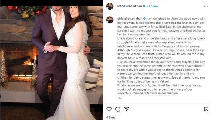 ریحام خان شادی کی پوسٹ شیئر کرنے کے 15 منٹ بعد ڈیلیٹ کر…